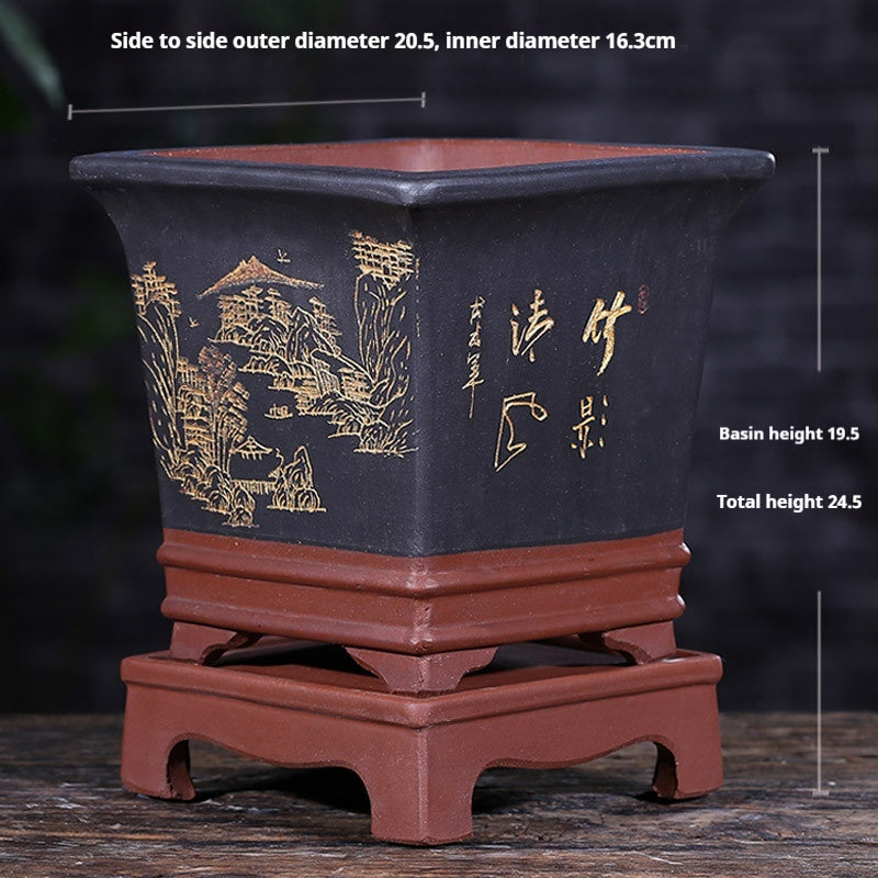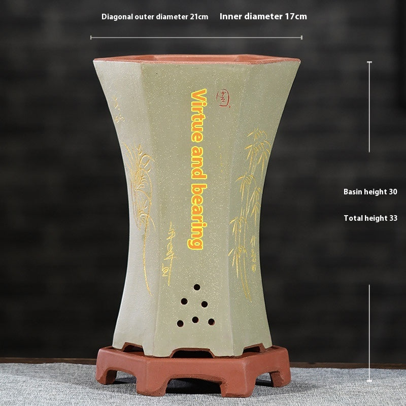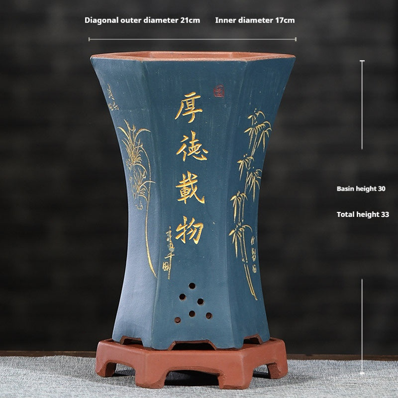 Elevate your home gardening with this universal-style giant planter. Constructed from stone and silk flower materials with purple sand finishing, this floor-type pot is not only sturdy but exquisite. In an assortment of shapes, colors, and styles, specifically hexagonal, barrel-type, square stick bottles, and antique cylinders. Each planter is furthered with a stiff support or saucer, rendering it very much suitable for orchids, decorative plants, or bonsai. Extremely suitable for indoor or outdoor.