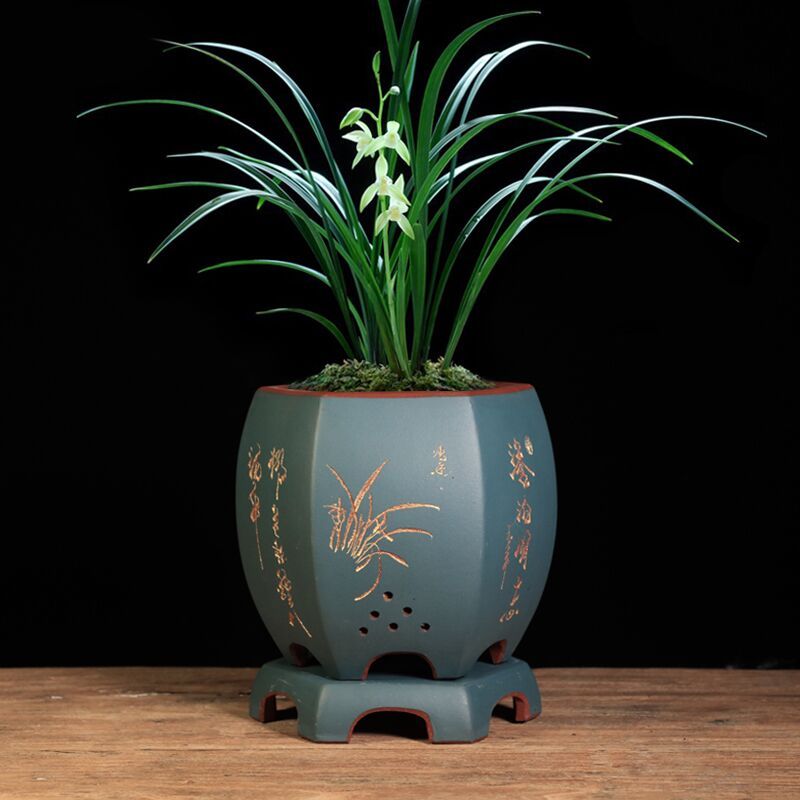 Bring elegance to your home gardening with this ethnic-style orchid pot. Crafted from durable stone and gilt, the hexagonal design adds a unique cultural touch. Each pot comes with a matching base, perfect for showcasing orchids or decorative plants indoors or outdoors. Available in multiple colors to suit any setting.