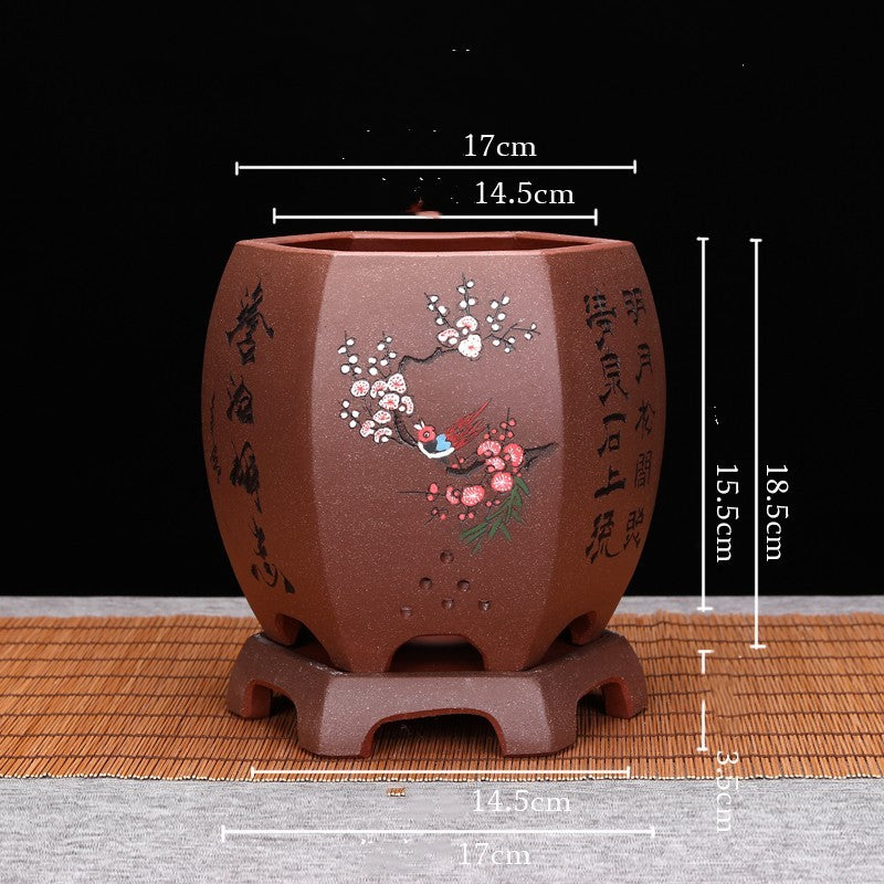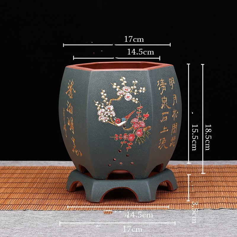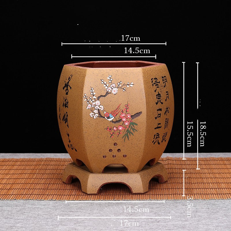 Vintage Hexagonal Orchid Pot with Base Ethnic Sand Design